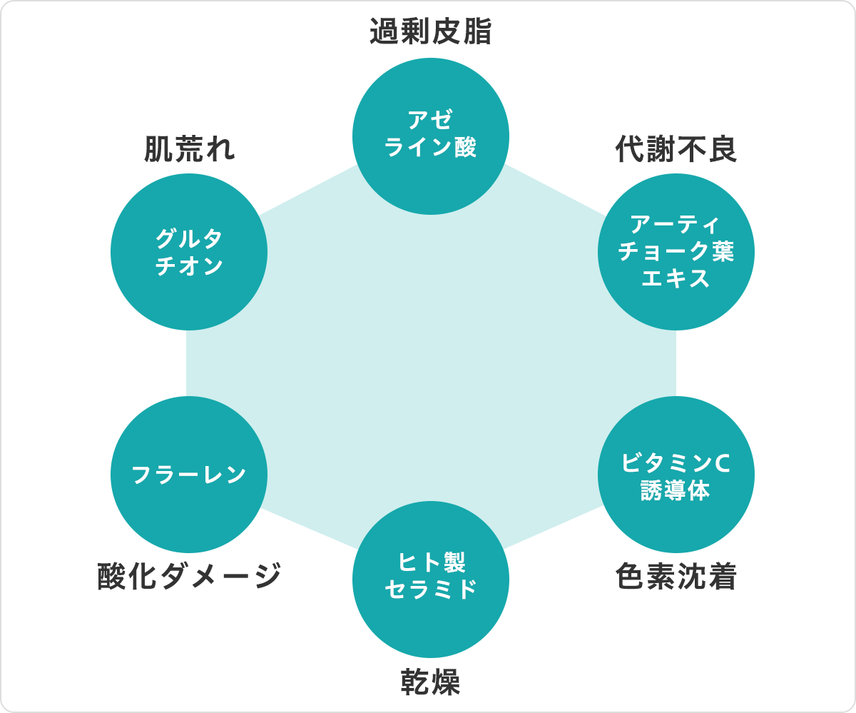 しかし、たとえニキビがあっても、肌全体にしっかりと水分と油分が保たれ、キメが整い、自然なツヤのある明るい肌であれば、ニキビを必要以上に目立たせずに済むのではないかと考えました。