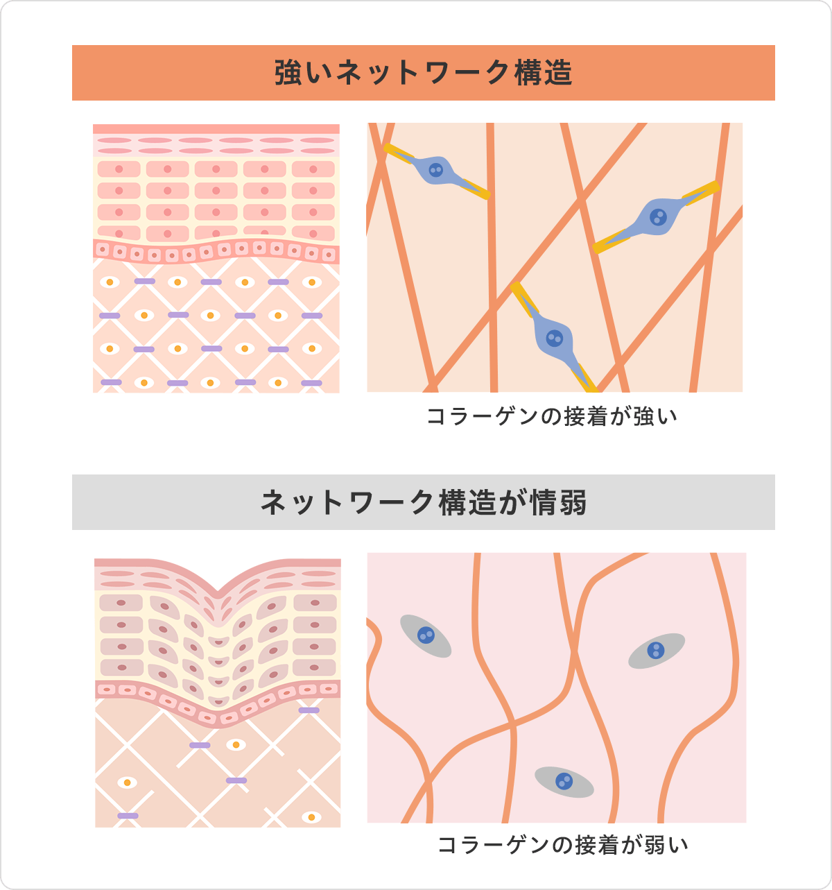 肌のハリ・弾力は、コラーゲンそのものだけでなく、それを結びつけるネットワーク構造が鍵。年齢とともに弱まるこの仕組みに着目し、細胞が活動するために欠かせない“エネルギー”をサポートする「こけもも若葉エキス」を配合しました。うるおいで満たしながら、強くしなやかな肌土台へ導き、若々しい印象を支えます。
